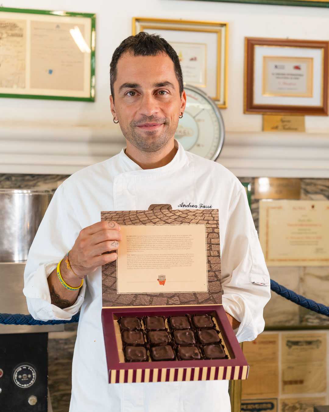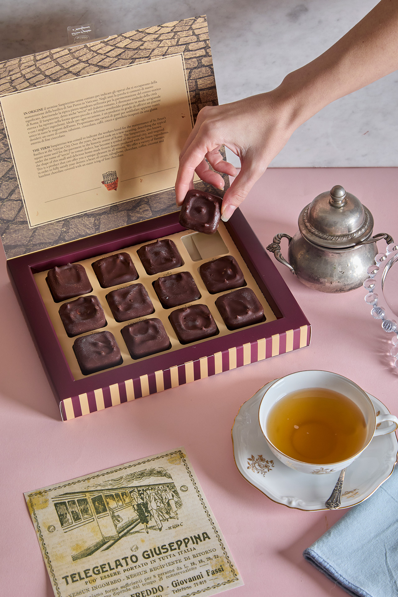 Scegli l’originalità e la romanità dei Sanpietrini® Fassi, semifreddi glassati al cioccolato confezionati in un’elegante scatola da 12 pezzi con gusti misti: crema, zabaione, gianduia, caffè, cocco e cioccolato (2 per ogni gusto).